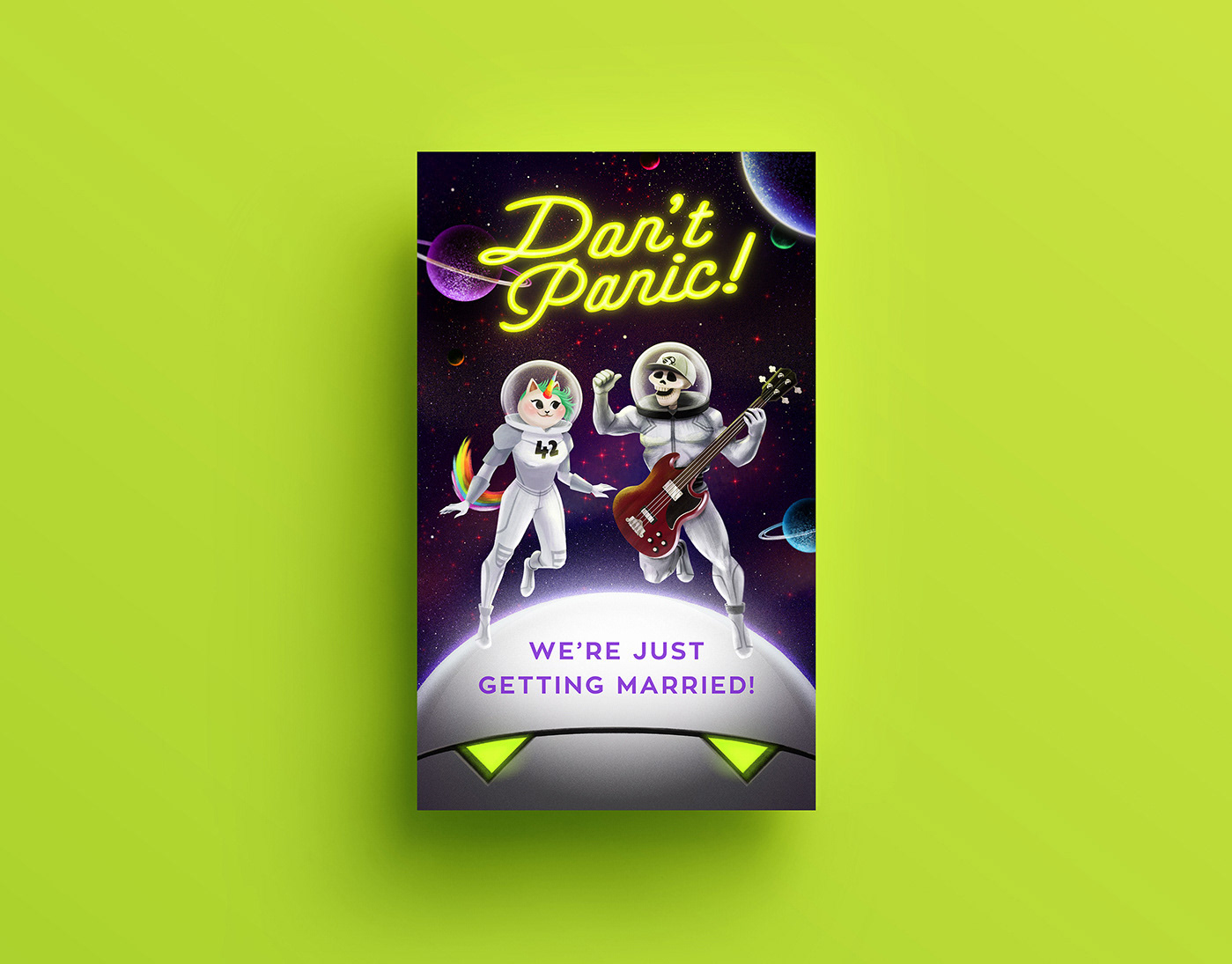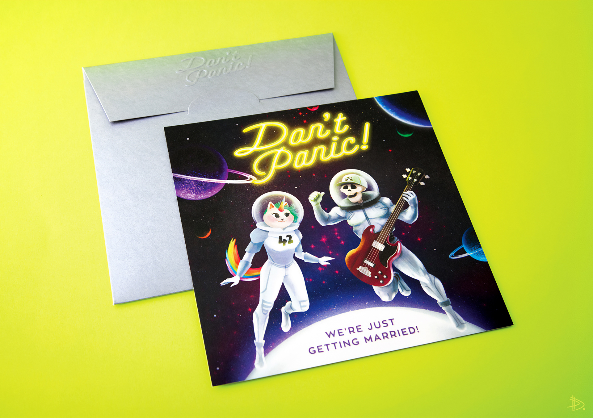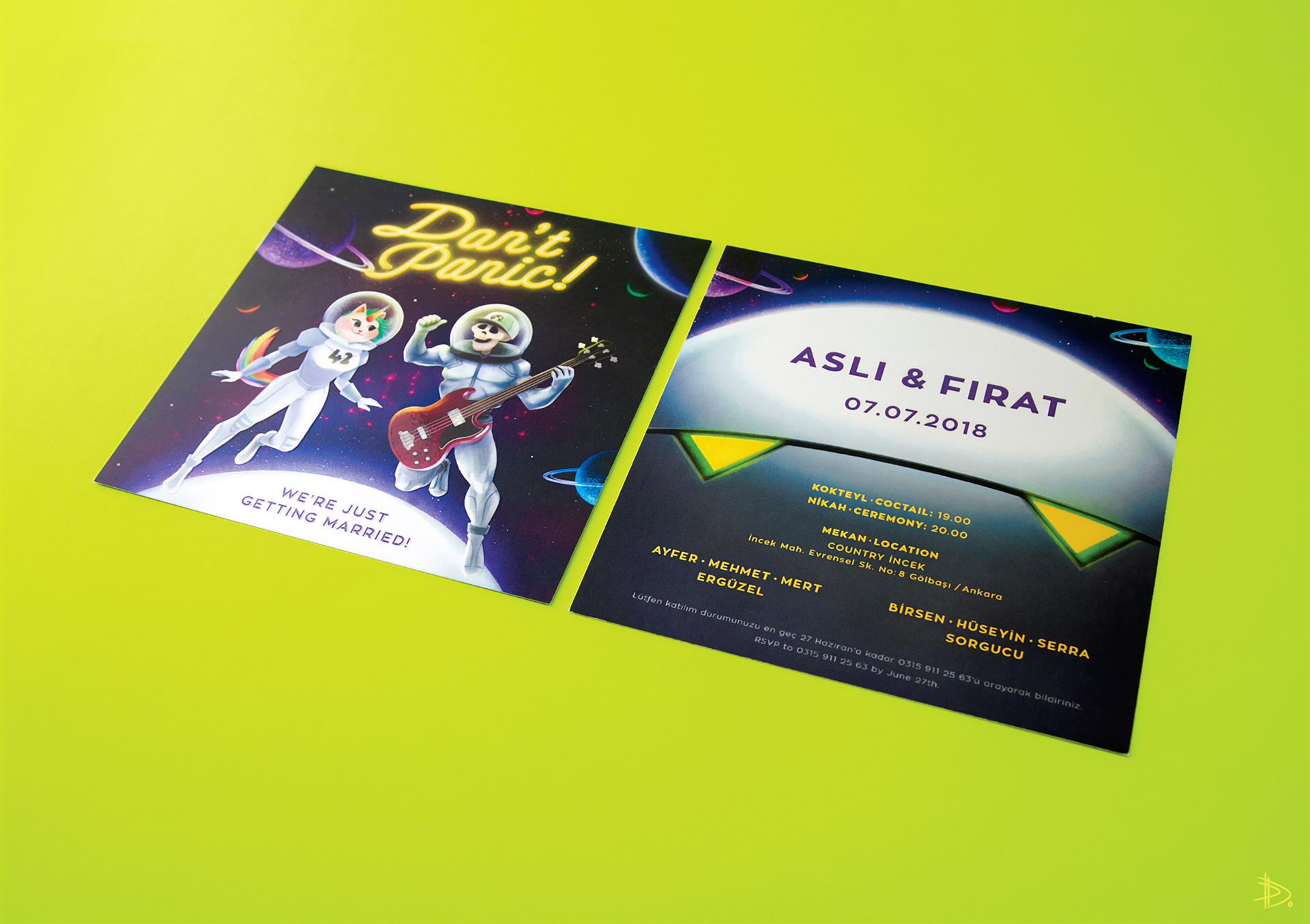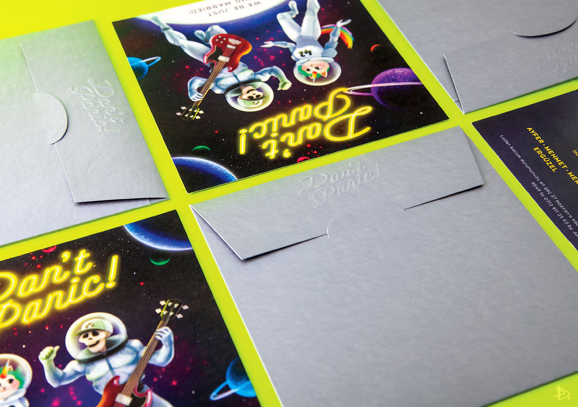 Don’t Panic: A special wedding invitation set designed for a couple who are fans of The Hitchhiker’s Guide to the Galaxy by Douglas Adams. The project included both digital and printed invitations, a menu, and additional printed pieces such as posters and magnets to be gifted to the guests. Don’t Panic was selected for display in the Invitation - Greeting Card Design category at the 37th Graphic Design Exhibition by the Graphic Designers Association (GMK) in 2018, Istanbul.