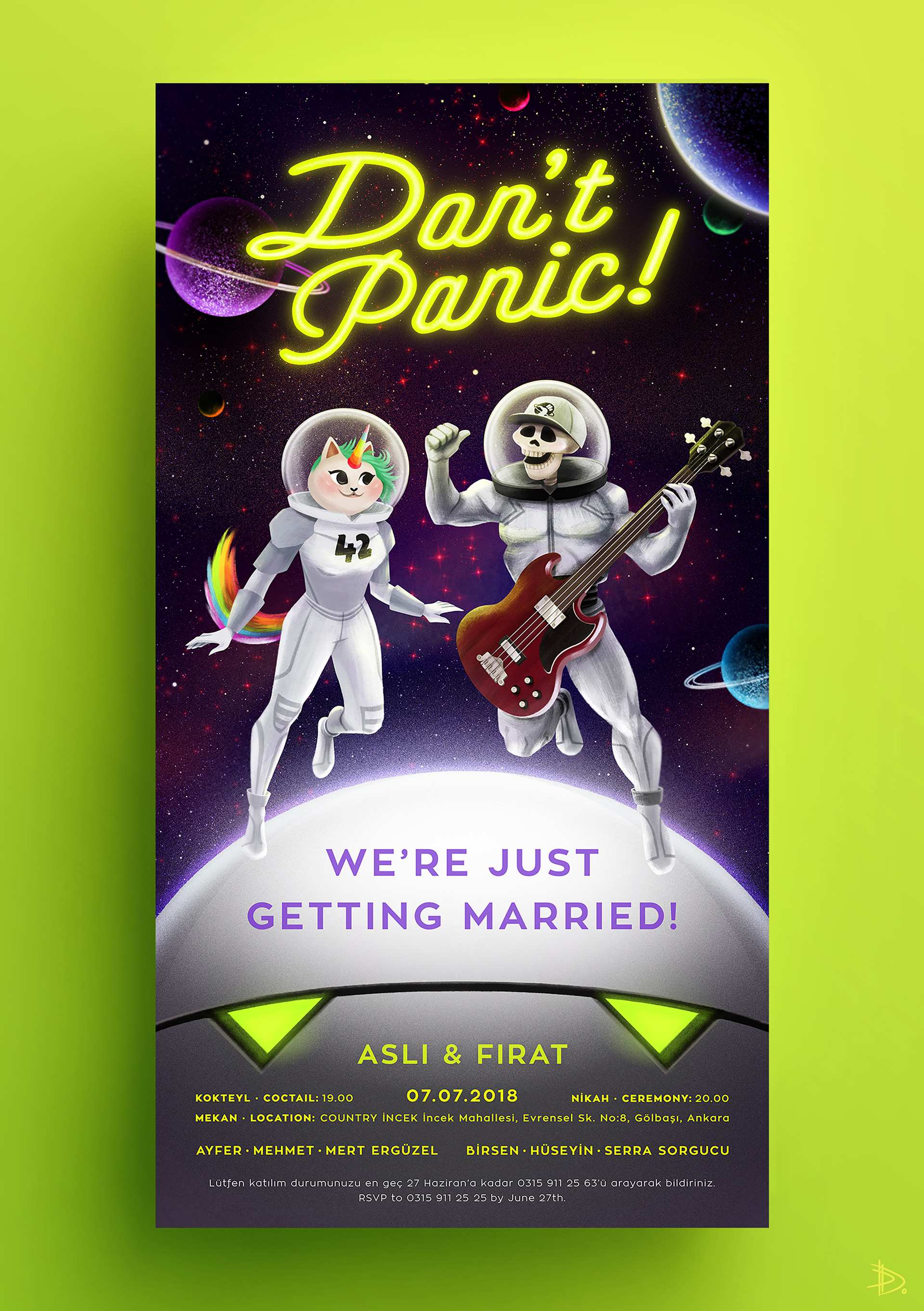 Don’t Panic: A special wedding invitation set designed for a couple who are fans of The Hitchhiker’s Guide to the Galaxy by Douglas Adams. The project included both digital and printed invitations, a menu, and additional printed pieces such as posters and magnets to be gifted to the guests. Don’t Panic was selected for display in the Invitation - Greeting Card Design category at the 37th Graphic Design Exhibition by the Graphic Designers Association (GMK) in 2018, Istanbul.